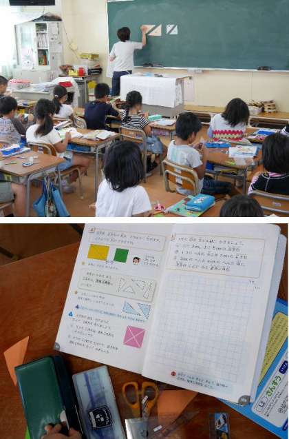 2年生の算数では、長方形や正方形を半分に切って直角三角形を作っていました。切った折り紙を三角定規で確認しています。