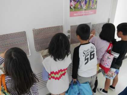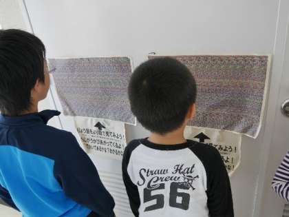 廊下に掲示してあるモザイク画を一生懸命に目をこらして見つめています。両目をより目にしてぼやっと見ていると、文字が立体にとびでてきます。なんて書いてあるかわかるかな。