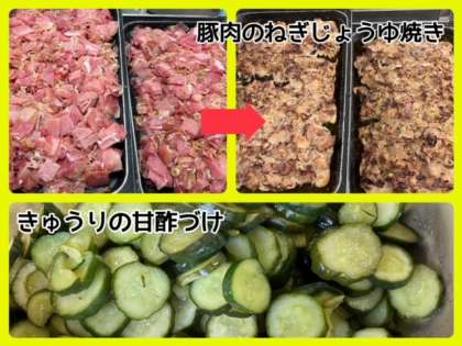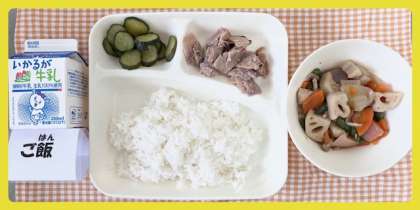 今日の献立は、豚肉のねぎじょうゆ焼き・ふきよせ煮・きゅうりの甘酢づけ・ごはん・牛乳でした。
