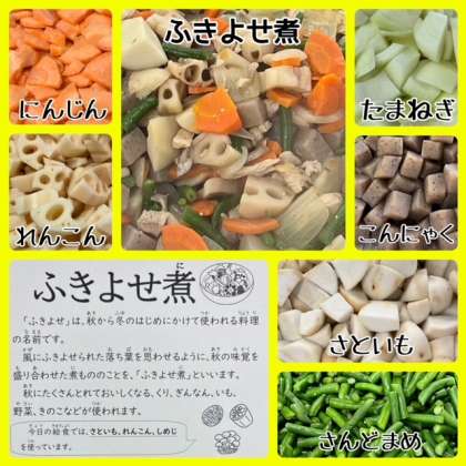 ふきよせ煮は、鶏肉、旬のさといもやれんこん・しめじなどを使用した煮ものです。「ふきよせ」とは、数種類の煮ものなどを彩りよく盛り合わせた料理につけられる、日本料理の名前です。