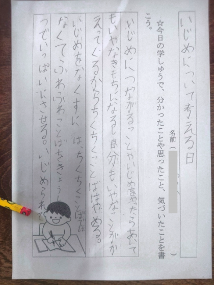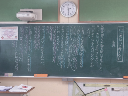 クラスで校長講話を聞いて思ったことや考えたことなどを書いたり、道徳で「いじめ」について取り上げて学習したり、学級の中での友達関係について振り返ったりしました。