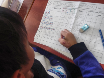 子どもたちは、「全部の数が2つずつ増えている」「2とびになっている」「1つ分の数がいつも2」ということに気付きました。