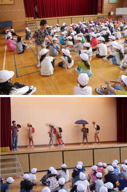 今日の児童集会は記憶力クイズでした。集会委員がいろいろなポーズや帽子をかぶったり、傘をさしたりして登場します。幕がしまってからがクイズです。「帽子は何人かぶってましたか?」記憶力がためされました。