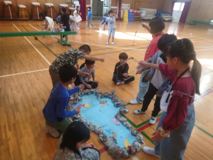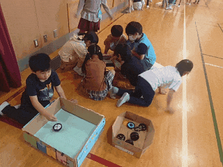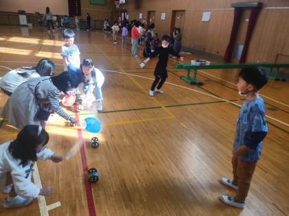 生活科の時間は、学年のみんなで手作りおもちゃで遊びました。