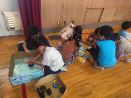 生活科の時間は、学年のみんなで手作りおもちゃで遊びました。
