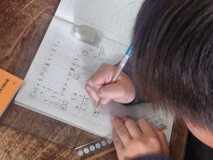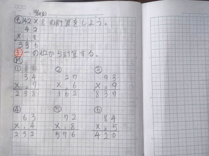 算数科の時間は、「42×8」など、2けた×1けたのかけ算の筆算を練習しました。