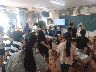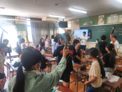 子どもたちは、"Do you have a (持ち物)?"と聞いて、机の上に置いている文房具を早く見つけるゲームをペアで楽しみながら学習しています。