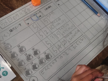 算数科の時間は、「5×□」のかけ算の答えには、どんなきまりがあるのか調べました。