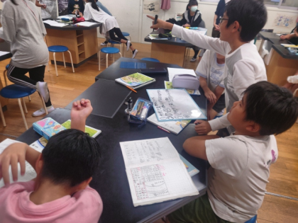 今日は、実際の川でも流れる場所によって川の様子に違いがあるのか、グループで予想を出し合いました。