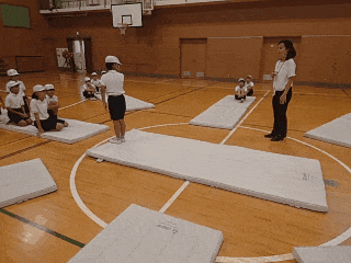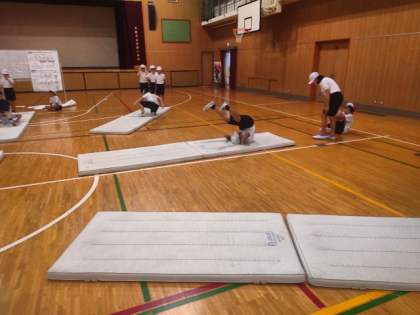 体育科の時間は、開脚前転、開脚後転、伸膝後転など、いろいろな技を練習しました。