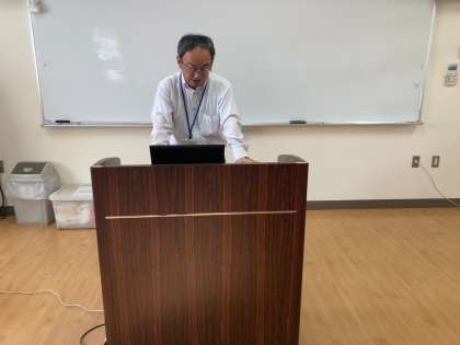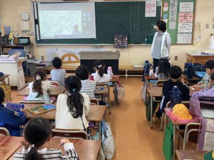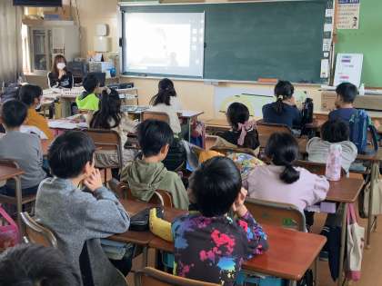 今日の児童朝会は、多目的室と教室をオンラインで結んで行いました。