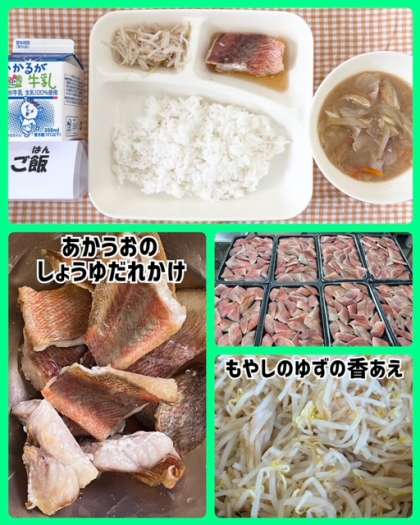 今日の献立は、あかうおのしょうゆだれかけ・豚汁・もやしのゆずの香あえ・ごはん・牛乳でした。