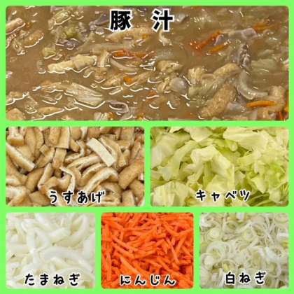 豚汁は、豚肉を主材にうすあげ・キャベツ・たまねぎ・にんじん・白ねぎを使用しています。