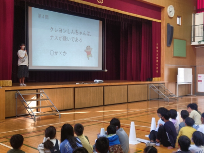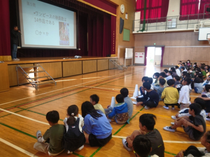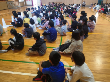 全校児童がドレミ班(たてわり班)で講堂に集まって行いました。