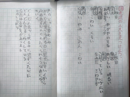 今日は、物語に出てくる「色」に着目して、表現の工夫について考えました。