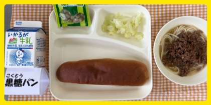 今日の献立は、タンタンめん・あっさりキャベツ・まっ茶大豆・黒糖パン・牛乳でした。
