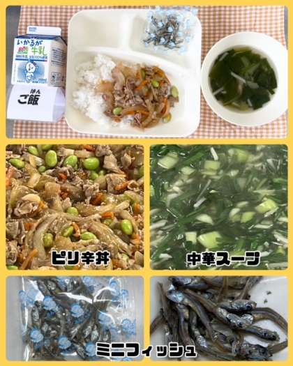 今日の献立は、ピリ辛丼・中華スープ・ミニフィッシュ・牛乳でした。