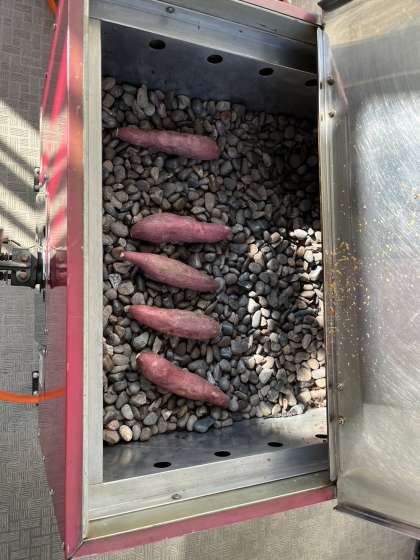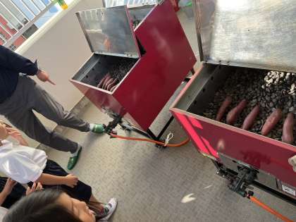 また、学校に持ってきていただいた「焼きいも機」の見学もしました。