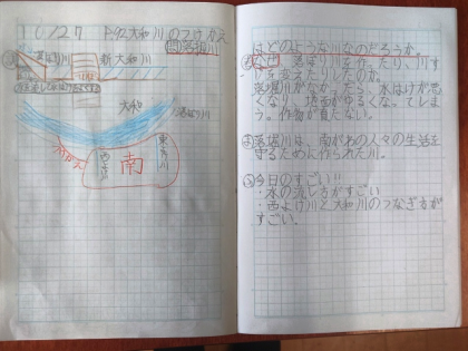 今日は、大和川のそばにある「落堀川」がなぜつくられたのか、みんなで調べました。