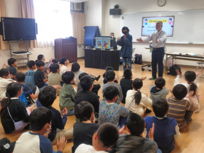 ペープサートなどを通じて、万引きなどの犯罪防止について、また、不審者による声かけ被害から身を守る方法についてのお話を聞きました。