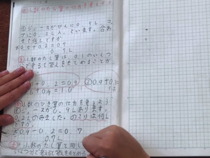 今日は、「0.5+0.2」「0.9-0,2」など、小数のたし算やひき算のしかたについて考えました。