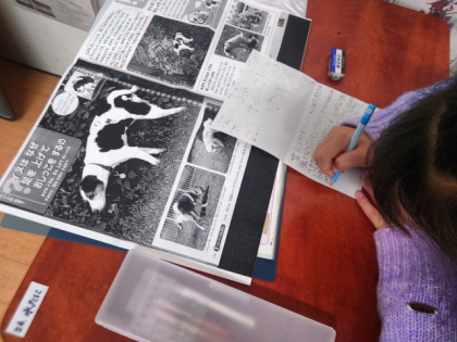 子どもたちは、ビーバーの巣づくりのすごさについて知りましたが、今度はいろいろな動物のひみつを調べてクイズを作っています。