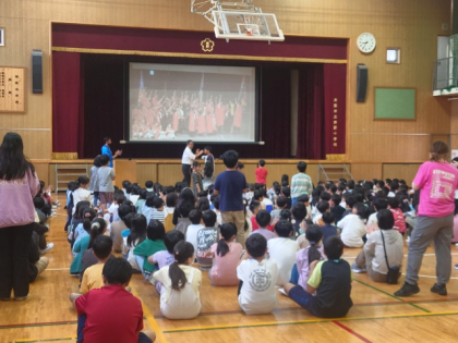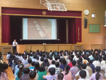 今朝の児童朝会は、全学年の子どもたちが講堂に集まって行いました。
