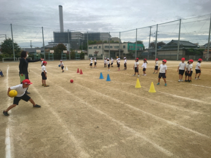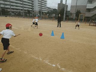 体育科の時間に、ボールを投げたり受けたりする練習をしました。