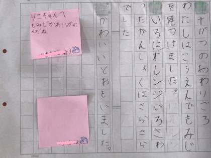 そして、「よかった」と思うことを「すてきカード」に書いて、友達の作文にはりました。