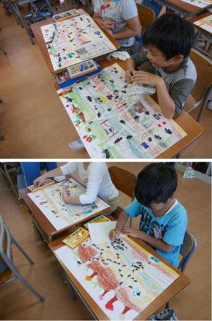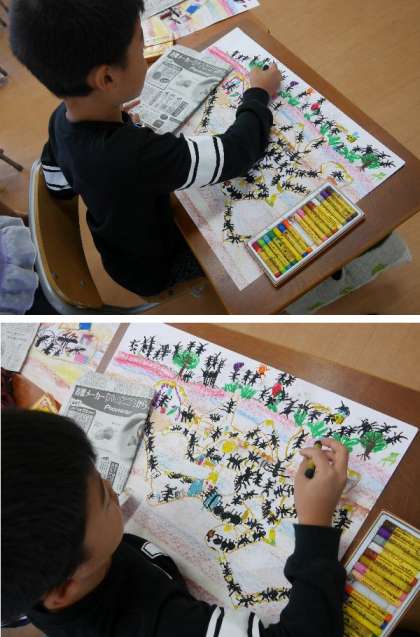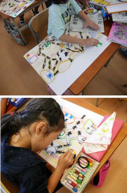 2年生のアリの巣の絵が出来上がってきました。たくさんのアリが描かれています。何匹あるのかなときくと、一生懸命に数えてくれました。すごい数のアリです。アリの巣には何でもあります。レストランや図書室、トイレなどたくさんの部屋があります。