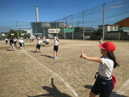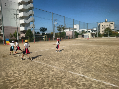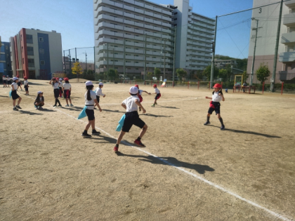 体育科の時間は、運動場でタグラグビーの学習をしています。