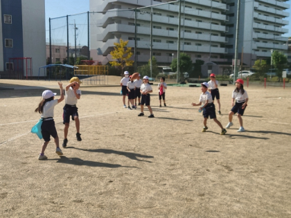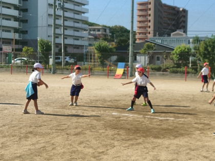 体育科の時間は、運動場でタグラグビーの学習をしています。