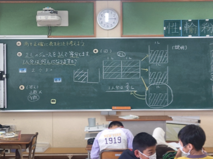算数科の時間は「2Lのジュースを3人で等分すると、1人分は何Lになるのか」という問題について考えました。