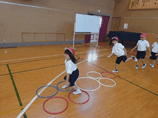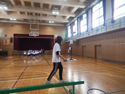 体育科の時間は、体育館で平均台、マット、フープなどを使って基礎体力を養うためにサーキットトレーニングをしました。