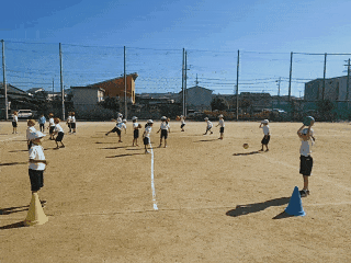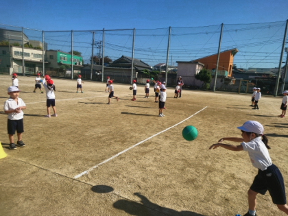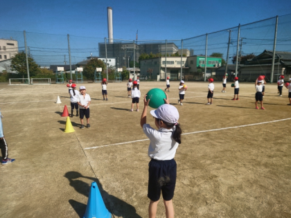 体育科の時間に、ボールを投げたり受けたりする練習をしています。