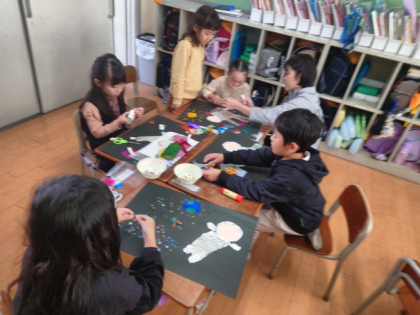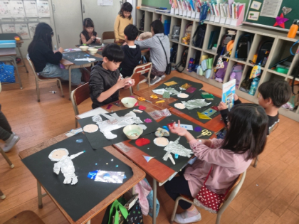 色紙を切り抜いていろいろなパーツを作り、画用紙に貼って宇宙飛行士や宇宙を表現します。