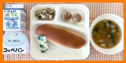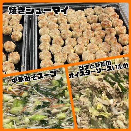 今日の献立は、焼きシューマイ・中華みそスープ・ツナと野菜のオイスターソースいため・コッペパン・ソフトマーガリン・牛乳でした。