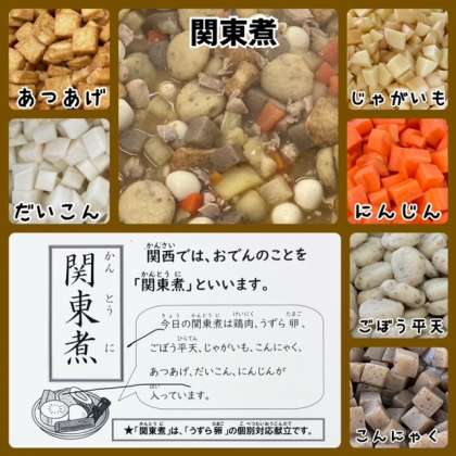 関東煮は、鶏肉・うずら卵・ごぼう平天・じゃがいも・こんにゃく・あつあげ・だいこん・にんじんを使用しています。この献立は、うずら卵の個別対応献立です。うずら卵除去食は、誤配を防ぐために給食室でピンクの食器に配食し、クラスと名前を書いた個票をつけて提供します。