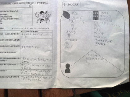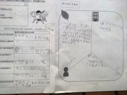 愛護会の方にお話をうかがったあと、さくら公園で発見したことをワークシートにメモしています。