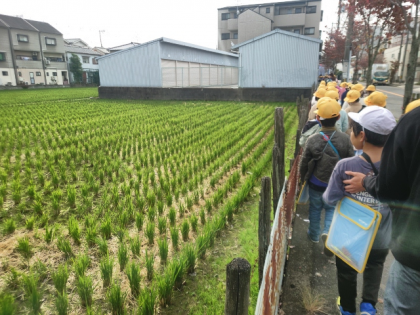 田んぼをながめながら、学校に向かいます。