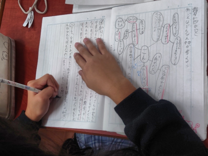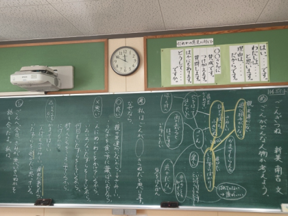今日は、ごんがどんな登場人物なのか読み取り、ごんは悪いきつねなのか、なぜごんがいたずらをするのかを考えました。