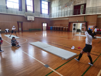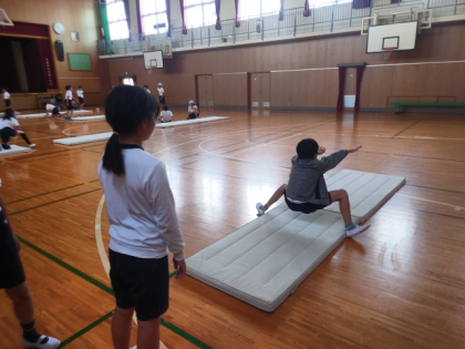 体育科の時間は、開脚前転・後転、側転、伸膝後転など、いろいろな技を練習しました。