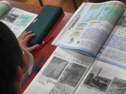 社会科の時間は、大阪府では、なぜ風水害が多いのか、副読本や資料集で調べました。