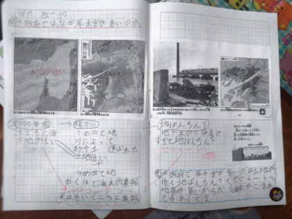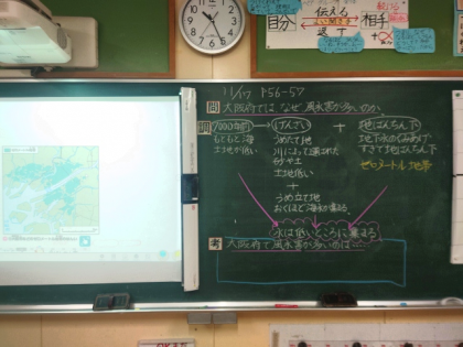 社会科の時間は、大阪府では、なぜ風水害が多いのか、副読本や資料集で調べました。