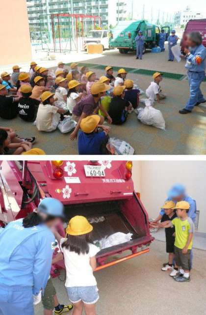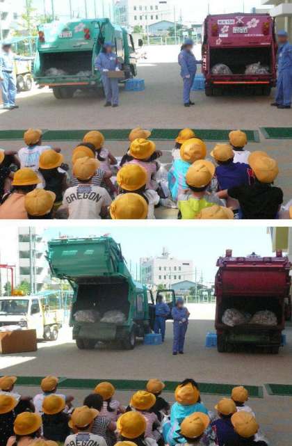 パッカー車がごみを圧縮して収集され、そのごみを取り出すときに車のうしろが大きくひらきます。みんなは「すごい」とびっくりしていました。あまり見ることができないので、よくしくみがわかりました。また、缶ジュースやアルミ缶のつぶしたものを持ち上げて重さを実感したり、実際にごみを収集車に入れてみました。機械を止めるボタンが三箇所もついていて、安全に考慮されています。