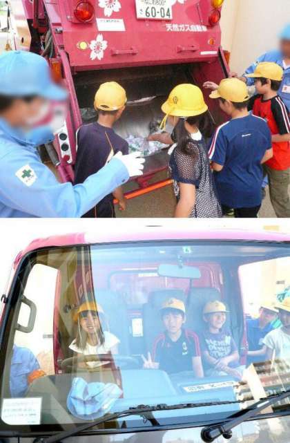 4年生は環境事業局体験学習を本校でおこないました。環境事業局から6名の方にきていただき、パッカー車(機械式ごみ収集車)の説明や体験をおこないました。
