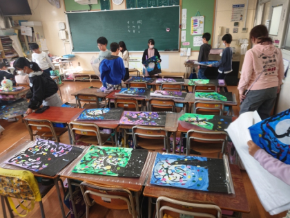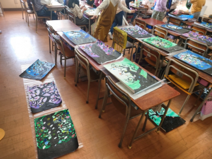 また、絵画作品を並べて、講堂に掲示する準備をしています。