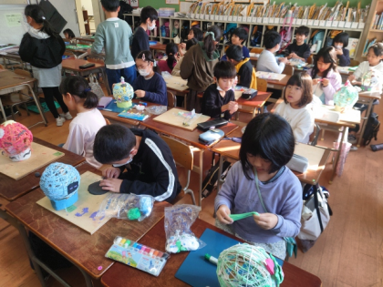 子どもたちは、立体作品「風せんランプ」の制作も仕上げに入っています。