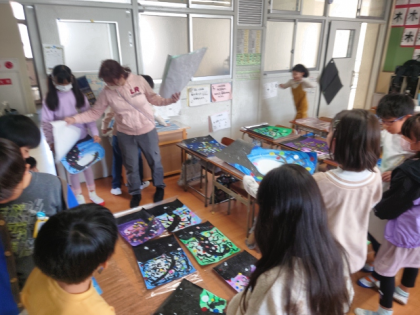 また、絵画作品を並べて、講堂に掲示する準備をしています。