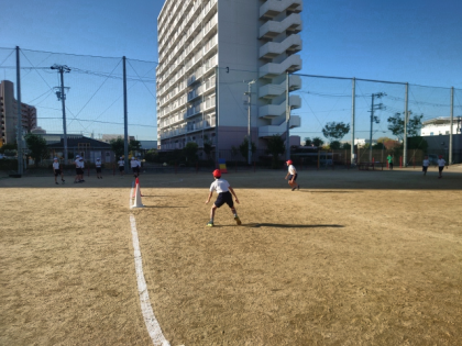 ボールを蹴ったランナーは、コーンをまわってベースに戻ってきます。